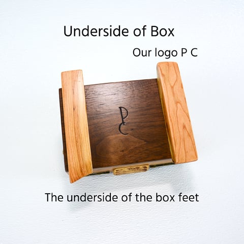 A handcrafted Keepsake Box made out of CherryWood with a Walnut wood bottom. We left the cherry bark on the lid and also on the feet of this box. Can't get more unique then this. There are felt tabs on the inside corners to ensure protection of the wood. The inside of the box that will hold your enduring item, has a thin foam liner to protect both the wood and your item. The lid adhere to the box on hinges with a built in lid stop to ensure protection. The bottom of the box is made out of Walnut. This is natural stained, so one sees the beauty of the wood. We then applied poly on this to protect. The underside has our unique "P C" brand so one knows it was specially created. This will last for generations!