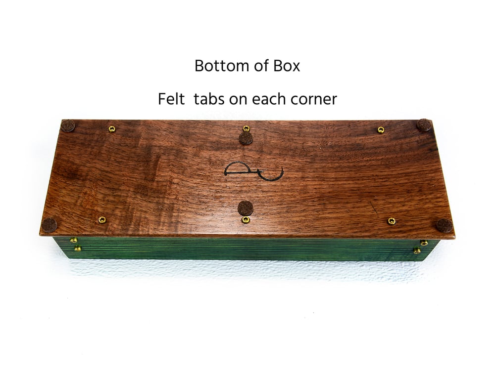 A handcrafted Keepsake Box made out of Exotic Zebra wood and dark Walnut as a base, with Pine front and back sides treated with Green stain and using the Pyrolysis Shou Sugi Ban technique. We used natural stain on the Zebra Wood. We then applied poly to protect. Talk about a unique box; this is it! The lid lifts completely off, and one could purchase elsewhere an engraved plaque to make this keepsake box the perfect gift! We also have felt tabs on the bottom so no worries on where it may be placed. The underside has our unique "P C" brand so one knows it was specially created. This will last for generations!