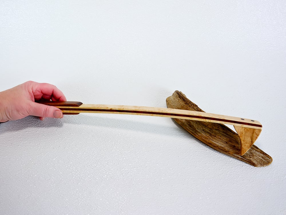 This handcrafted wooden backstratcher is made of Birdseye Maple Wood and accented with Walnut. This handcrafted wooden back scratcher is as functional as it is handsome! We have our PC logo on the inside spine of the backscratcher so you know you have an authentic handmade creation by us! We finished it off with a natural stain with multiple sprays and sanding with a satin finish of polyurethane.