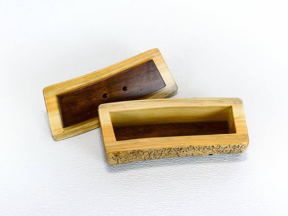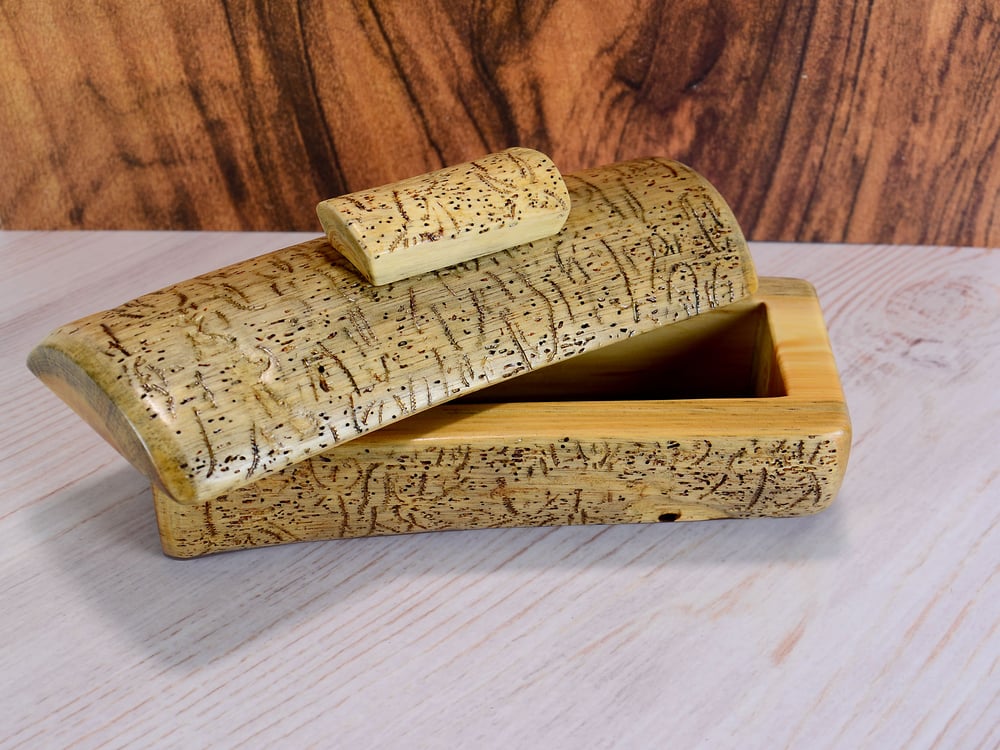 A handcrafted Keepsake Box made out of Spruce with Walnut. The natural worm markings are left in the wood, giving this treasure box a uniqueness like no other! The bottom is lined with beautiful dark walnut which carries through to the inside bottom of the box. Walnut also adorns the inside of the lid. This gives such a beautiful contrast to this piece! The lid lifts completely off. This is natural stained, so one sees the beauty of the wood. We then applied poly on this to protect. We also have felt tabs on the bottom so no worries on where it may be placed. The underside has our unique "P C" brand so one knows it was specially created. This will last for generations!