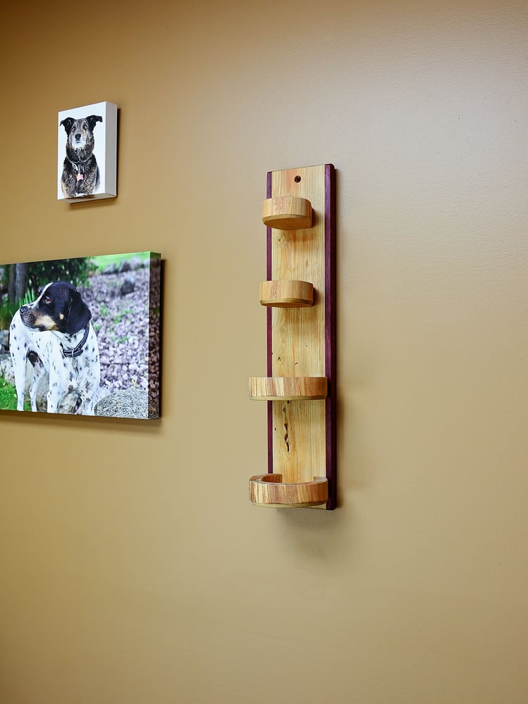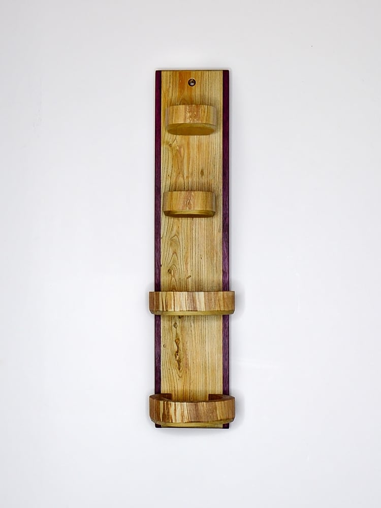 This unique shelf is made of cherry wood and accented with the exotic wood of Purple Heart. There is unique coloring in this wood and markings so we kept it as natural as possible by treating it with Danish Oil. This is already to hang and comes with two (2) vertical keyhole hangers on the backside. By using these type of hangers one ensures it will be steady and balance even the heaviest of loads. We also put in a hanger hole in the top, so use whatever one you prefer.