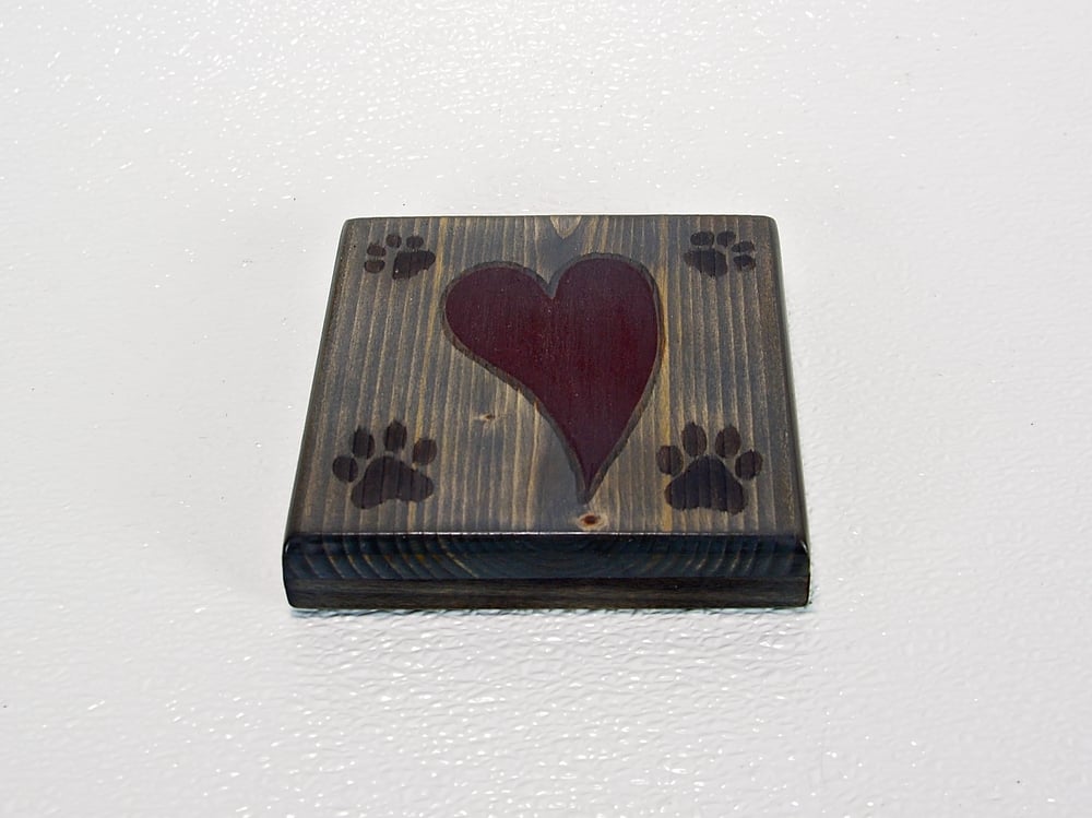 One wooden dog lover coaster with paw prints and a carved heart filled with red epoxy