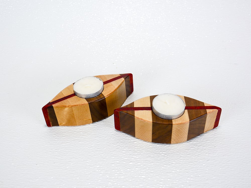 This Wood Tea Light Candle Set is made of Dark Walnut, Maple and the exotic wood of Padauk. Each of the tea lights will come with a tea light.