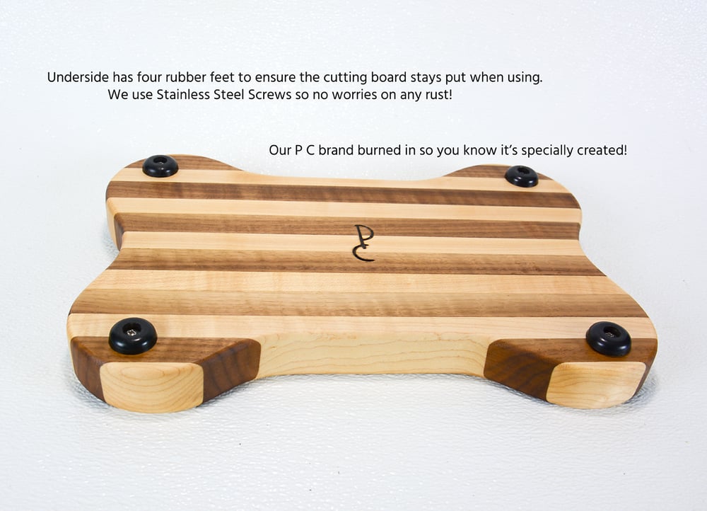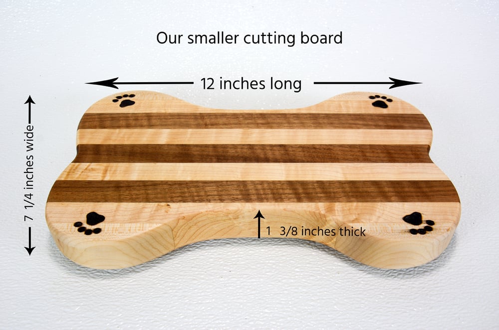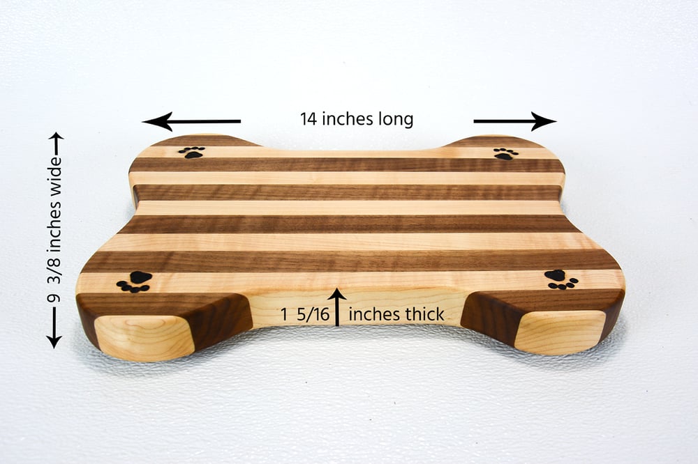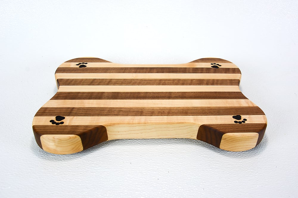 The Harvard of Cutting Boards! Made with the chef and animal lover in mind! This beautiful cutting board is made from hand selected walnut and maple. Edges have been beveled and rounded off with care and percision. There are (4) doggy paws burned into each corner of the board. This cutting board has been sanded using 6 different grits of sand paper making the surface as smooth as glass. We used stainless steel screws to attach the rubber feet on the underside, so no worries on the screw rusting out! We have seasoned this board with food safe Mineral Oil and then conditioned it using a combination of mineral oil and bees wax mix. You will not be disappointed in the quality and functionality of this cutting board!